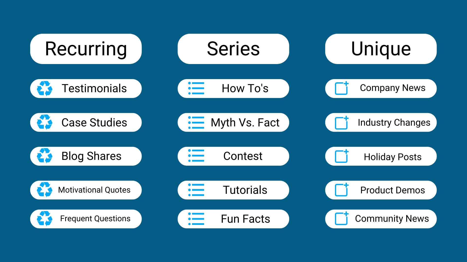 Below is one of the categorizations that should be used to split up and organize your social media content. Depending on your company, product/service, and audience you can mix and match recurring, series, unique, and recyclable content to make up engaging social media content each month that is sure to establish you as an industry leader.